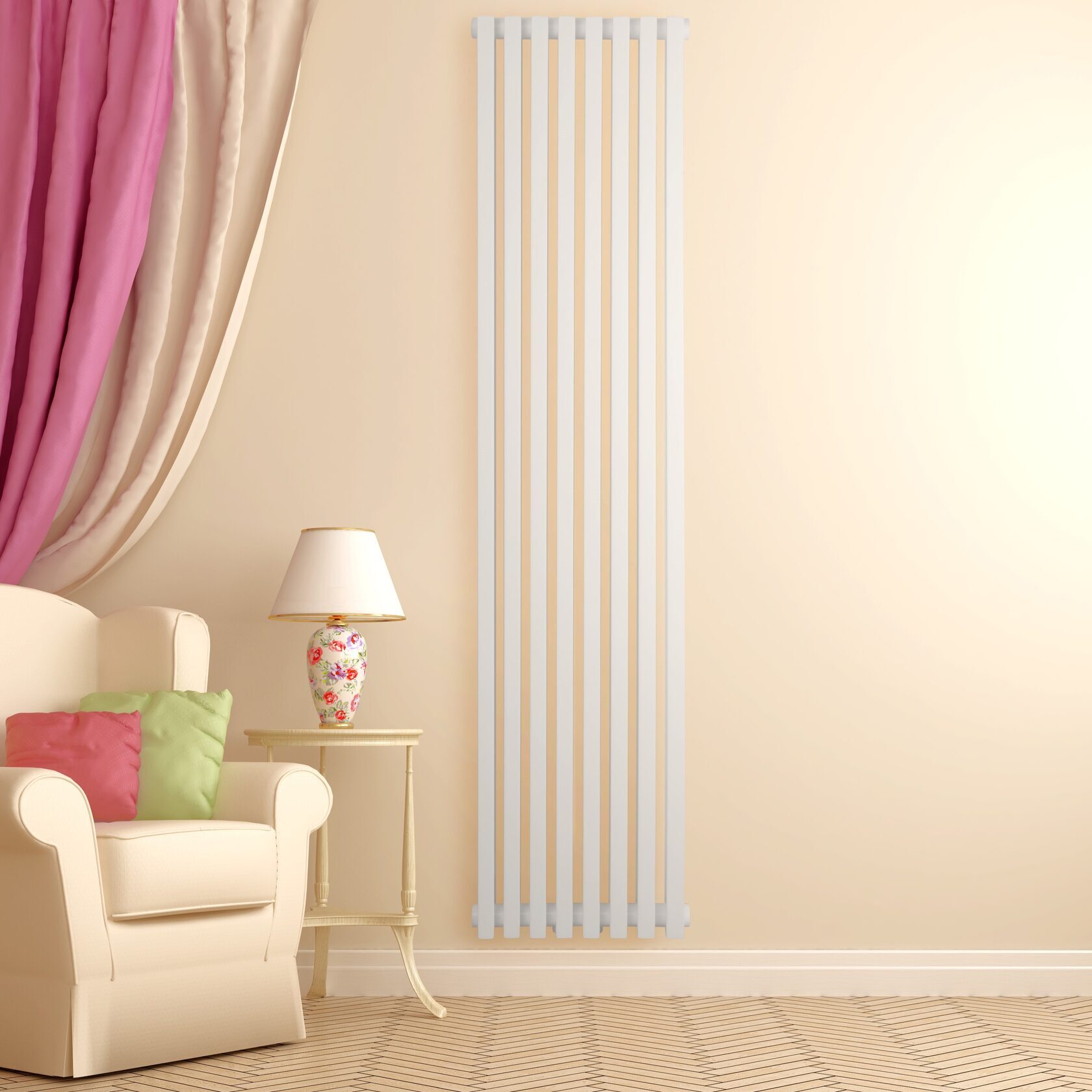 Quantum 1500×325 — вертикальний радіатор з чіткою геометрією, створений для сучасних просторів, де важливі дизайн і функціональність. У виконанні білий цей радіатор виглядає особливо контрастно та підкреслює лінії труб.